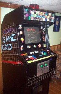 I studied about twenty classic games on various websites before I decided that the bare bones of the Grid had to be that beautiful case from Defender, the multi-button screaming classic. I found the dimensions of a Defender box on the web, and started planning. The case itself is made from 3/4" plywood, with the computer stored behind the fold-down "coinbox".