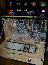 To the left you can see inside the main bay. The left joystick and the buttons are hardwired into into the backside of an old computer keyboard, the kind that had actual solder connections, and real switches in the keys. Some dedicated gamers dispense with the keyboard itself, and wire directly into the "matrix", the little brain in the keyboard. My design lets me do set-up work on the computer with the case panel down, and then close up for gameplay. On the Grid, the main stick was wired into a standard USB gamepad. I studied another dozen home-brew machines to find the control panel layout I liked best, and ended up with one of my own, which allows most arcade games to run easily. Art for Art's Sake